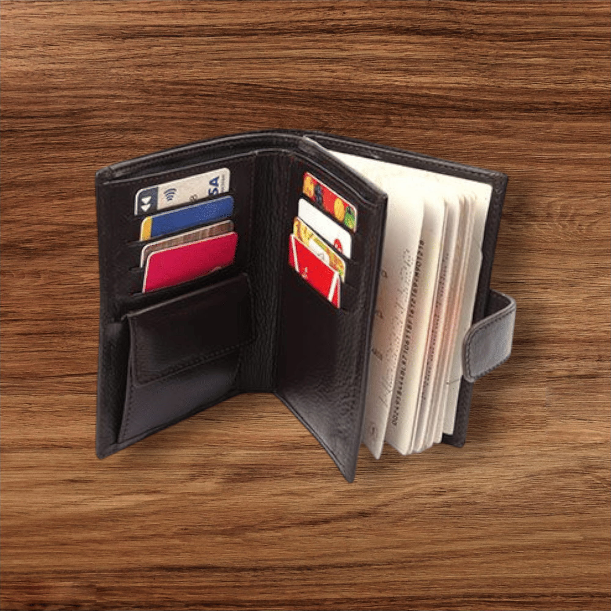 Портмоне из натуральной кожи на два отделения, закрывается на кнопку. Портмоне на подкладке, с отделением для паспорта, с двумя открытыми отделениями, в одном отделении карман на молнии, с открытыми карманами, с карманами для визиток, с карманом на клапане для монет.