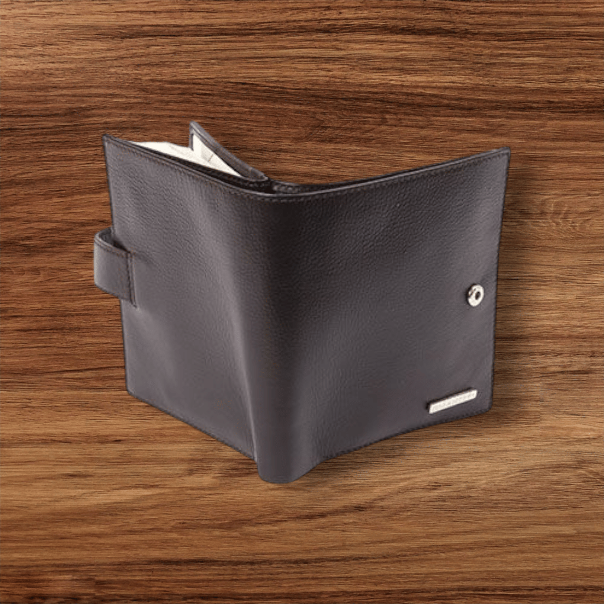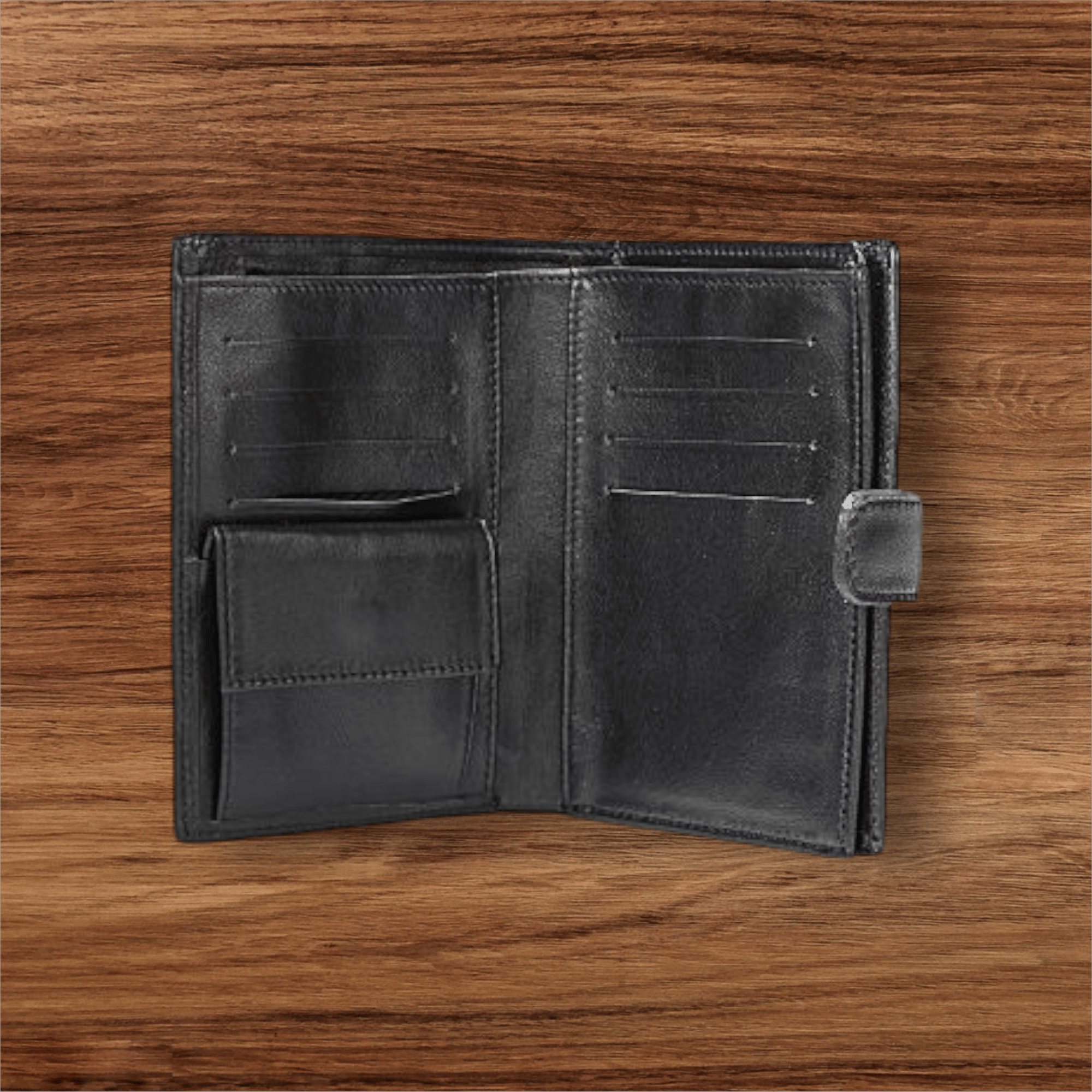 Портмоне из натуральной кожи на два отделения, закрывается на кнопку. Портмоне на подкладке, с отделением для паспорта, с двумя открытыми отделениями, в одном отделении карман на молнии, с открытыми карманами, с карманами для визиток, с карманом на клапане для монет.