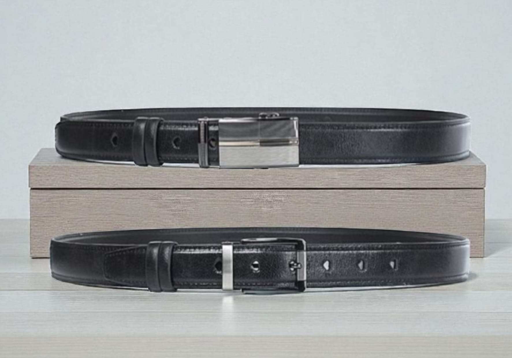 Мужской ремень из натуральной кожи. Две пряжки в комплекте позволят менять ваш образ. По изнаночной стороне нанесен логотип в виде тиснения. Ремень представлен в подарочной упаковке.