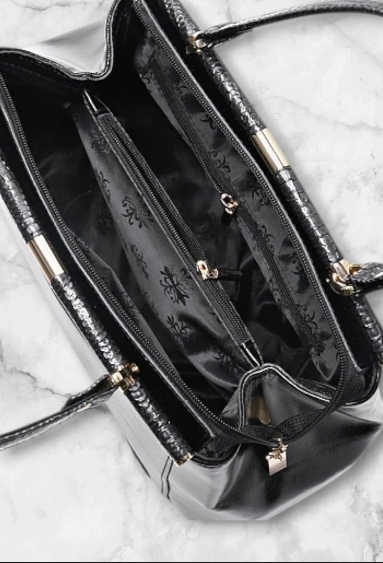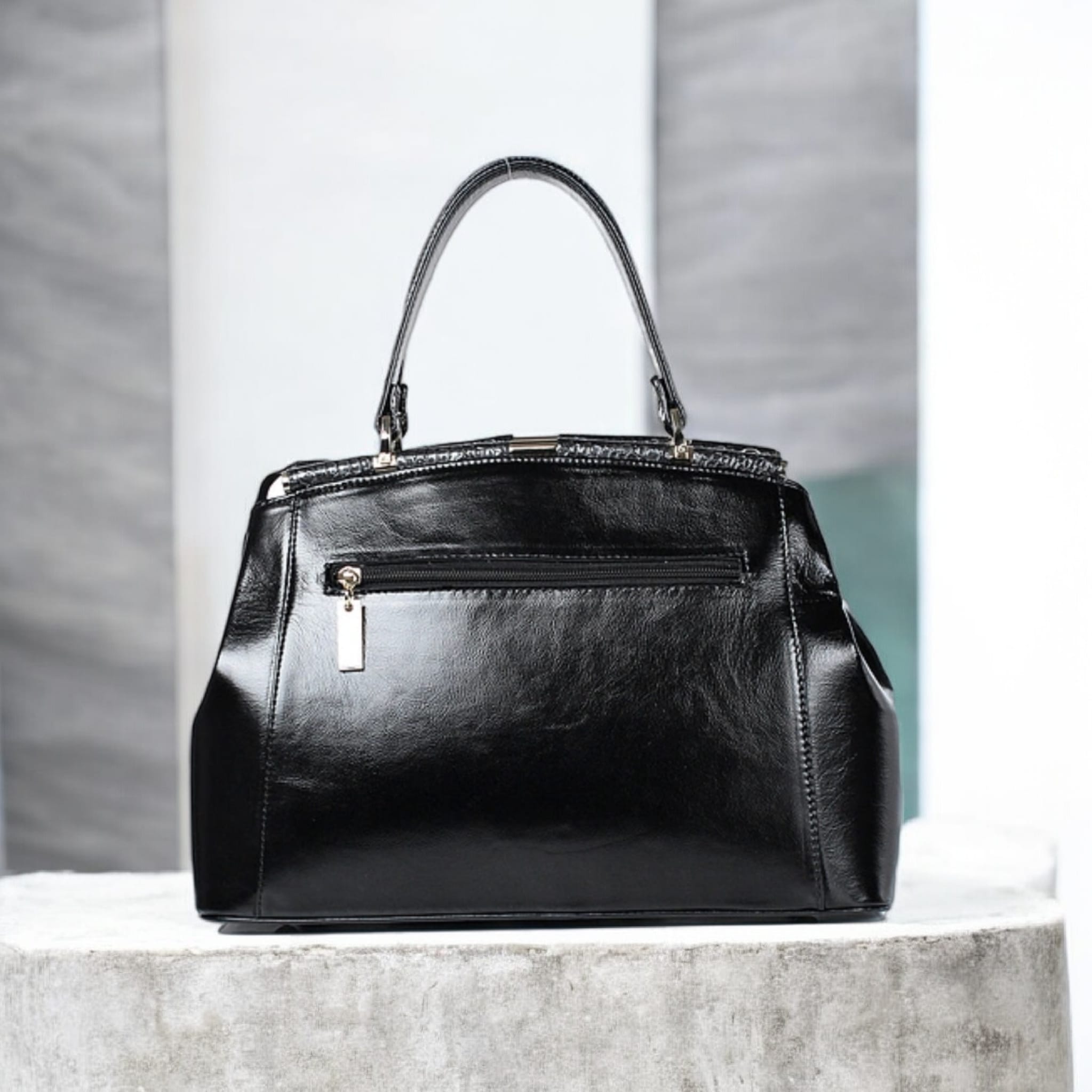 Сумка из натуральной кожи закрывается на застёжку-молнию, с двумя ручками, со съёмной ручкой-ремнем, с карманом на задней стенке, закрывающимся на застёжку-молнию, с пуклями на дне. Сумка на подкладке, с открытым накладным карманом, с подвесным карманом, закрывающимся на застёжку-молнию, с карманом-перегородкой, закрывающимся на застёжку-молнию.